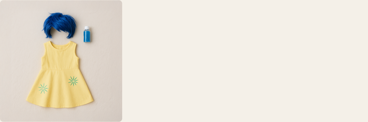 • Choose one: Joy yellow dress, Sadness blue roll-neck and glasses, Anxiety orange striped top and jeans